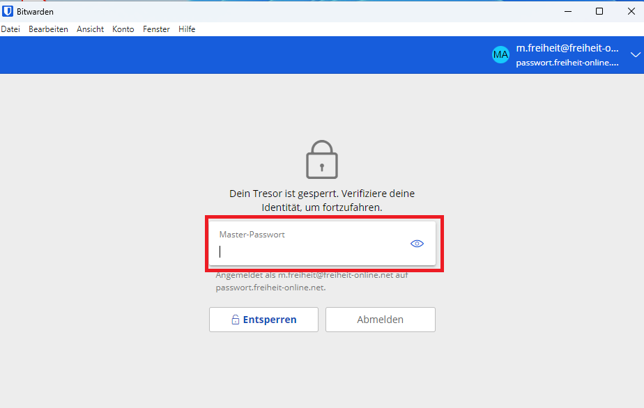 Im Passwortfeld das Masterpasswort eingeben, ggf. ist auch noch die Eingabe eines 2. Faktors nötig (Code per App oder E-Mail).